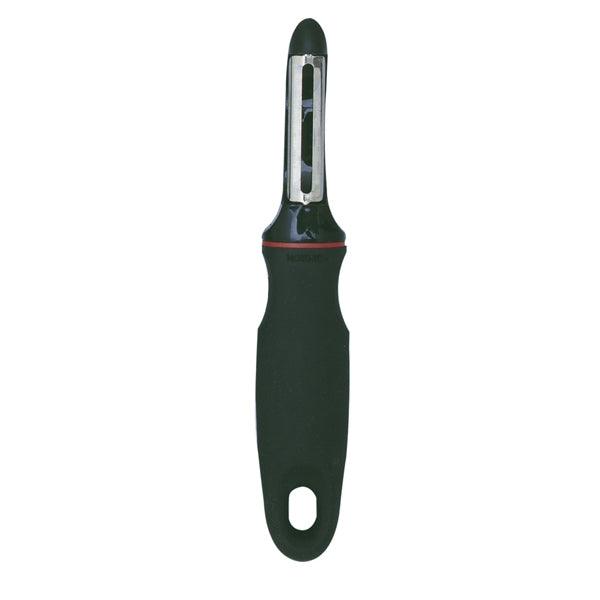 Peel your potatoes, carrots, and veggies with ease! An essential addition to your kitchen, this peeler features a soft, comfortable santoprene handle for easy gripping and sharp blades for effortless peeling. Ergonomically designed to fit well in either left or right hands. Also includes potato eye remover. Measures 7.25in/18.5cm.