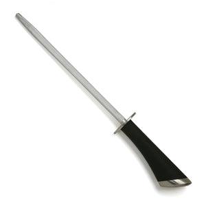 Easily sharpen all of your kitchen knives with this sleek, easy to use tool! Made of durable, stainless molybdemun vanadium steel and abs plastic, this sharpener helps keep your cutlery in prime condition. Features a comfortable, ergonomic, soft handle for easy gripping. You'll have no problem cutting your holiday turkey or ham! Sharpeneing steel measures 7in/18cm and handle measures 5.75in/14.5cm. Hand washing recommended.