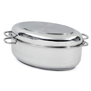 Perfectly roast your turkey, chicken, duck, and more with this quality roaster! Made of durable, professional gauge stainless steel, this versatile dish features a thick, try-ply encapsulated base for even heat distribution and more efficient cooking. Includes a heavy duty removable, adjustable rack that can be placed on the base of either the roaster or its lid, allowing fats and juices to drain. This multi-purpose pan can also be used on your stovetop for sauteing. Features comfortable offset handles that are easy to grip. Impress your family and friends with your delicious, healthy dishes! Base holds 12qt/11.4L or 18-24lbs of meat, while lid holds 5qt/4.8L. Hand washing recommended.