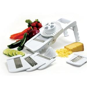 An essential addition to any kitchen, this versatile, multi-purpose tool does it all! From slicing (3-7mm) to shredding to grating, this tool features durable, razor sharp blades that are interchangeable to accommodate all of your cooking needs. Easily adjust your slicing thickness to suit various meals. Also ideal for julienning or crinkle cutting your veggies or fruits (6mm or 9mm). Includes a safety food holder that doubles as a citrus juicer. Rests securely on most counters due to concave notches on the bottom. Hand washing recommended.