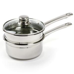 Perfectly cook your sauces, gravies, custards, and more with this multi-purpose double boiler! Made of durable stainless steel, this boiler features a base that seals in heat and prevents burning. Also ideal for melting chocolate, caramel, and other candies. Includes a vented tempered glass lid to allow steam to escape and prevent boiling. Pots unstack for everyday use, including boiling pasta, rice, and more! Holds 1.5qt/1.4L. Hand washing recommended.